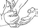 This brings us to the second category of Gestures, Squeeze Hand. Squeeze Hand means exactly that. The idea behind this activity is for the resident to squeeze your hand. Rather than opening and closing their hands upon request, as described in the preceding section, you are placing your hand inside the resident’s, as indicated in the drawing above and asking Mary to squeeze your hand.